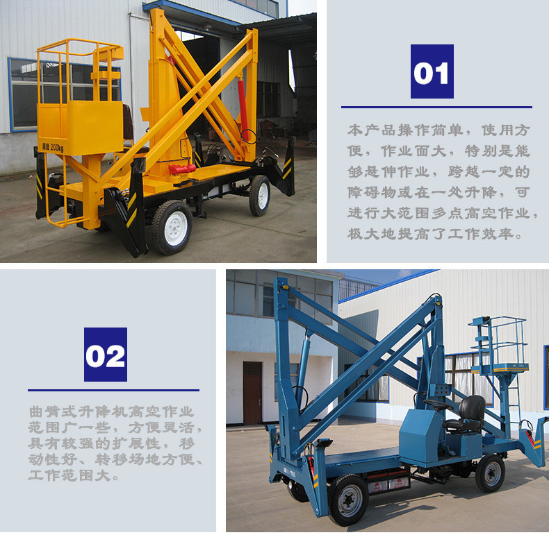 曲臂升降機(jī)又稱之為高空作業(yè)平臺(tái)車,是垂直式、剪叉式升降平臺(tái)的替代產(chǎn)品,利用柴油機(jī)為動(dòng)力,加電瓶采用電啟動(dòng),自支腿、自升降、自行走,360度旋轉(zhuǎn)作業(yè)。操作簡(jiǎn)單,使用方便,作業(yè)面大,特別是能夠懸伸作業(yè),跨越的障礙物或在一處升降,可進(jìn)行大范圍多點(diǎn)高空作業(yè),地提高了工作效率。