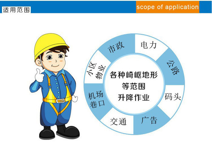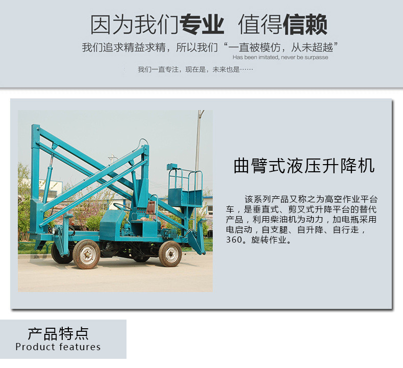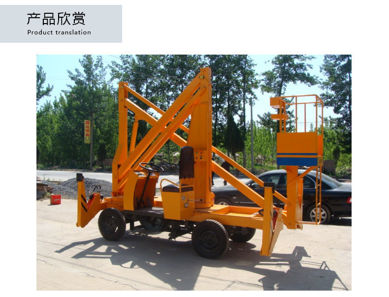 廣泛用于市政、電力、路燈、公路、碼頭、廣告、交通、機(jī)場(chǎng)巷口、園林、通訊、攝影、小區(qū)物業(yè)、廠礦企業(yè)車間、野外各種崎嶇地形等范圍升降作業(yè)。
